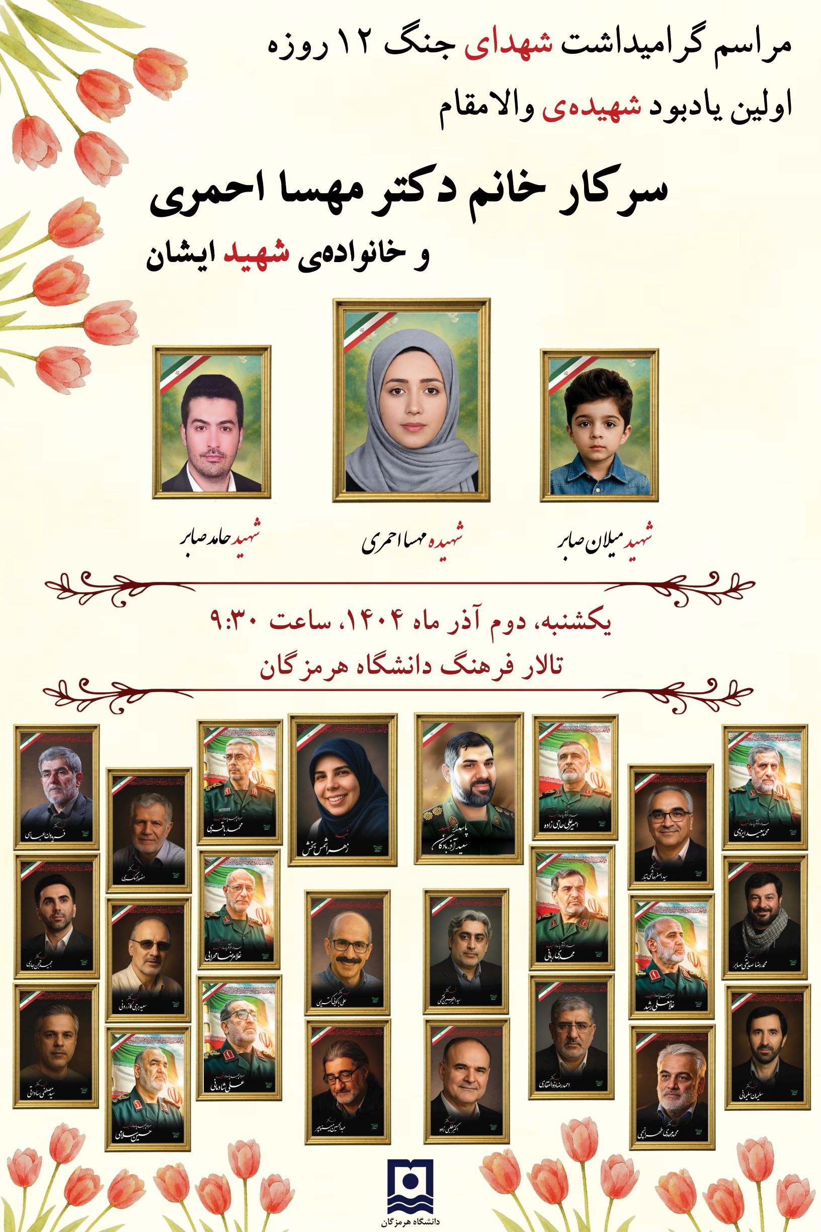 مراسم گرامیداشت شهدای جنگ ۱۲ روزه و اولین یادبود شهیده والامقام دکتر مهسا احمری، روز یکشنبه دوم آذر ۱۴۰۴ از ساعت ۹:۳۰ در تالار فرهنگ دانشگاه هرمزگان برگزار می‌شود. این آیین معنوی با هدف پاسداشت ایثار، ترویج فرهنگ مقاومت و دعوت از دانشگاهیان برای حضور پرشور در این بزرگداشت برگزار خواهد شد.
