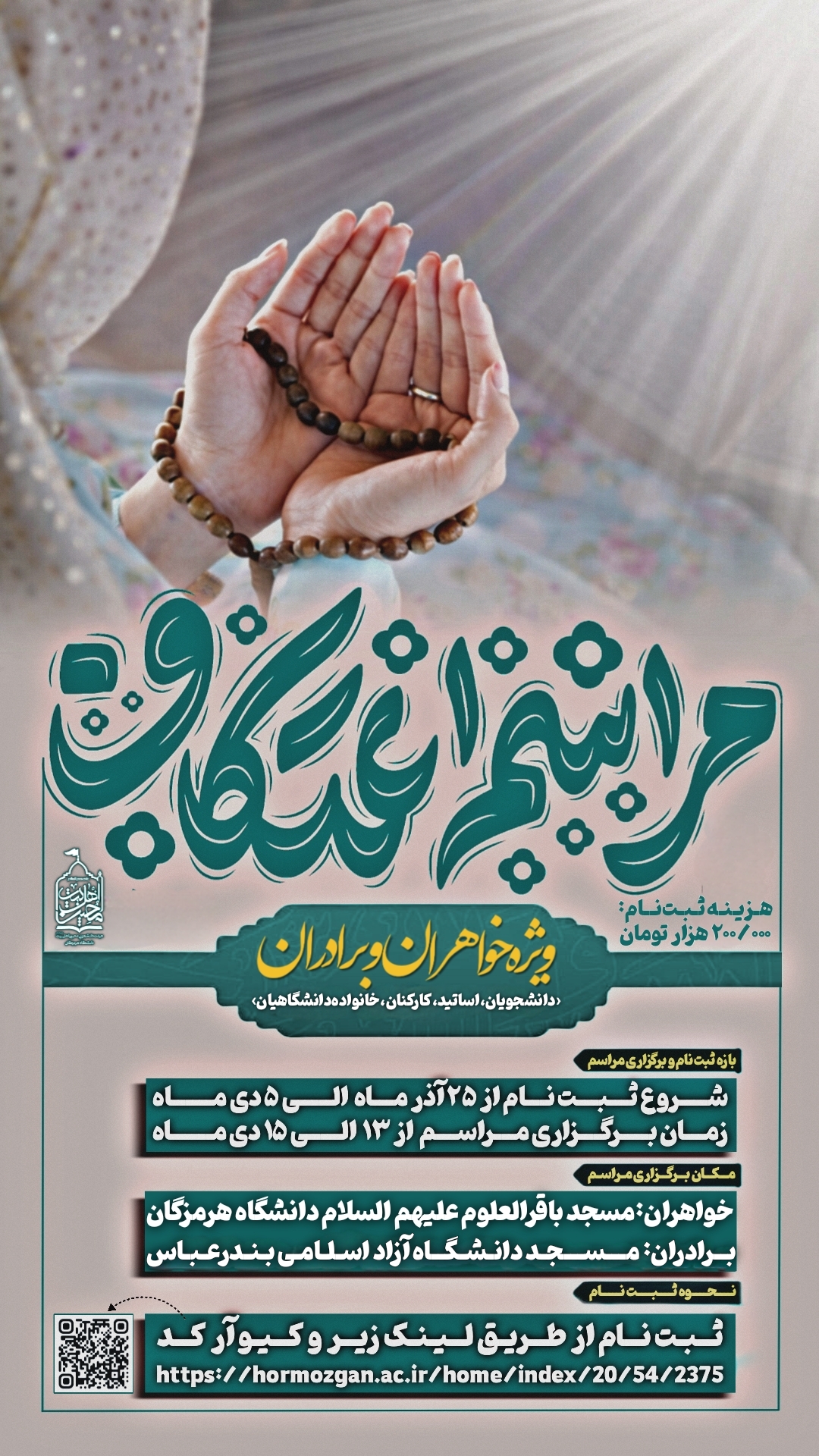 دانشگاهیان محترم دانشگاه هرمزگان می‌توانند از تاریخ ۲۵ آذرماه لغایت ۵ دی‌ماه با مراجعه به لینک زیر نسبت به ثبت‌نام در این مراسم معنوی اقدام نمایند: